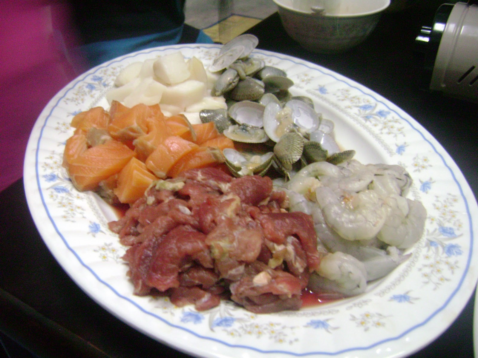 Yang kiub putih ujung tu, isi ikan kod, yang warna oren tu pulak, isi ikan salmon, pastu, hirisan daging, udang (saya buang kulit sebab nak jadikan stok utk tomyam tu) dan lala.